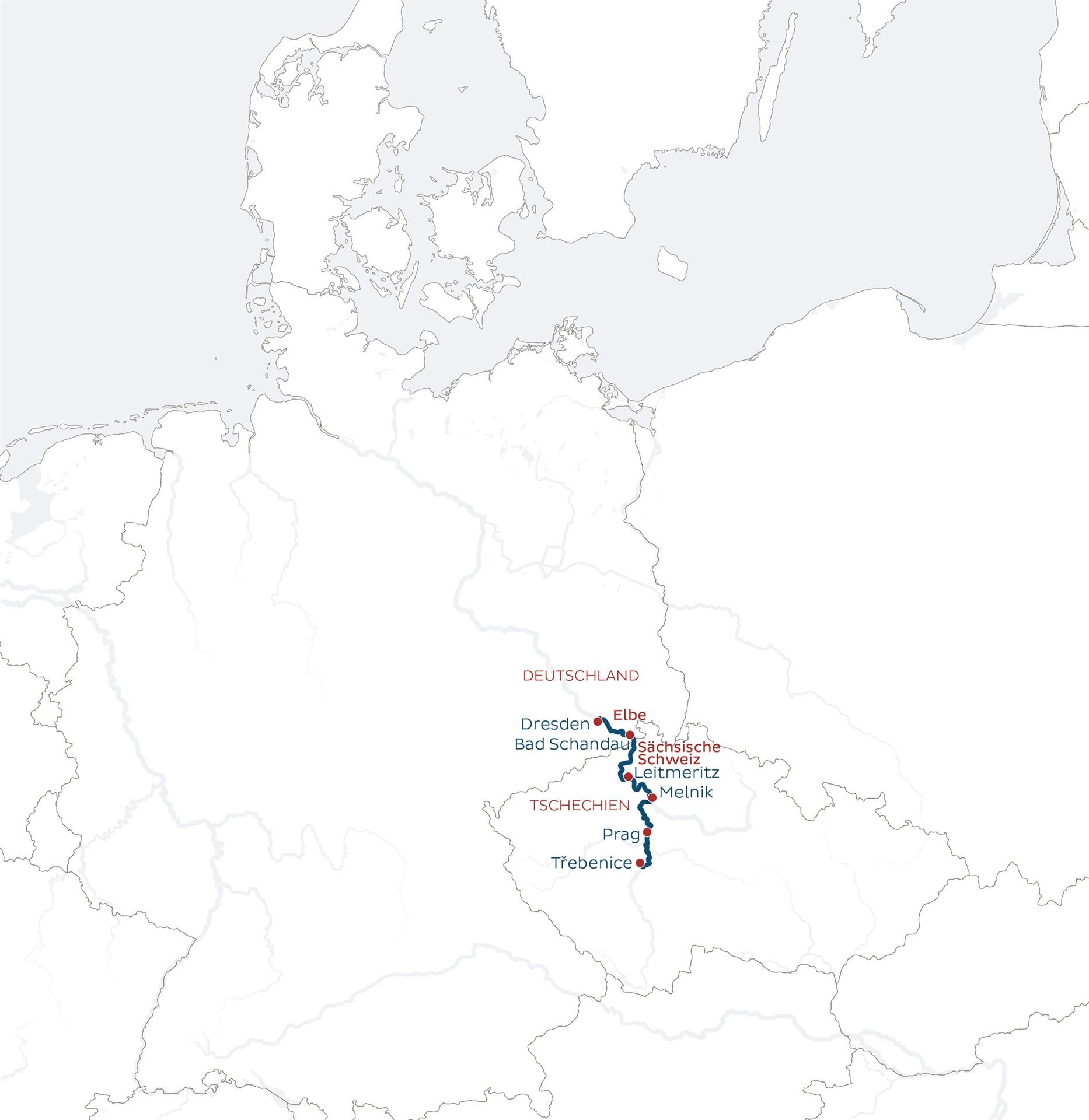 Reiseroute: Dresden - Bad Schandau - Passage Böhmische Pforte - Leitmeritz - Melnik - Mlcechvosty - Prag - Trebenice -Prag